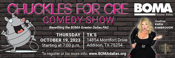 The BOMA Greater Dallas Government Affairs Committee is excited to bring back the one event to make you ROTFL, the 3rd Annual Chuckles for CRE Comedy Show. This stand-up comedy event to benefit the BOMA Greater Dallas Political Action Committee will feature top Dallas-based comedians for your laughter and enjoyment.